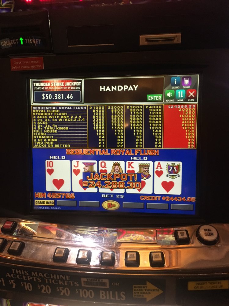 Playing nickel slots at Thunder Valley in CA. Playing max bet of 25 credits or $1.25 per hand, was lucky enough to draw a Royal Flush in sequence download/file.php?mode=view&id=2745. A major jackpot for a nickel machine.