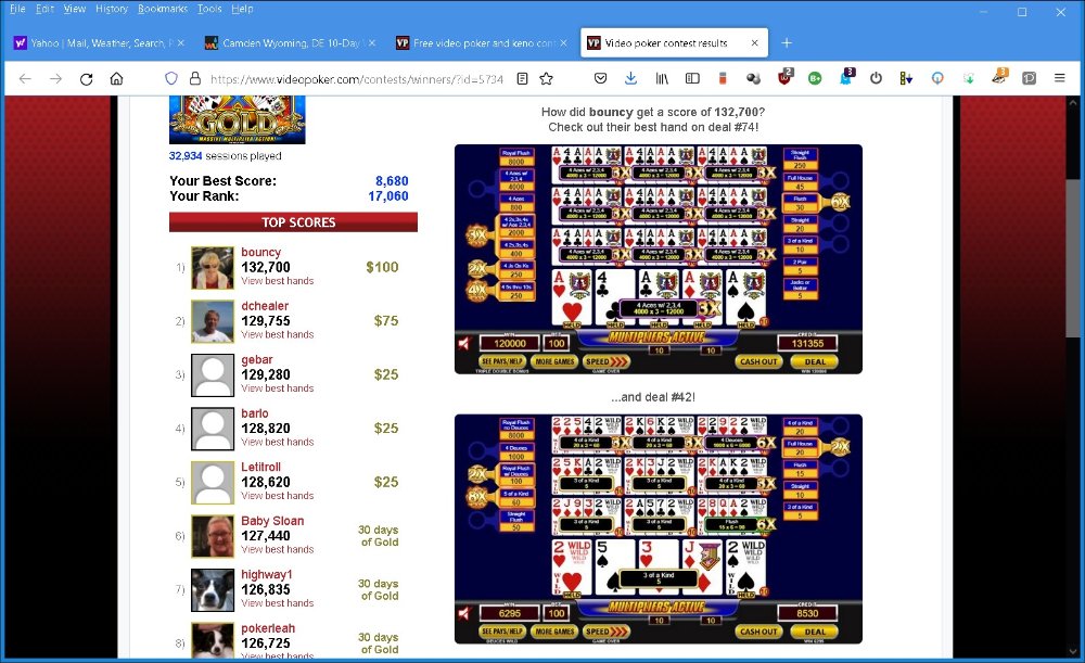 The winning screens of the last weekly contest show 1 triple-double and 1 deuces wild.
