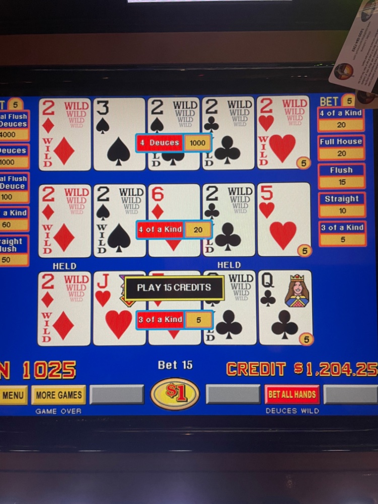 When I realized she was trying to get my attention from the other side of the bank of machines, I thought she was going to pass out. She was shaking and shocked for over 10 minutes. Luckily the slot attendant was there almost immediately. We both would look at the machine, look at each other, smile, kiss or laugh, and then look back at the machine, then at each other in shock. And, of course she just sat there not wanting to play another hand because it was so pretty. Ironically, when she did start play her first hand it was a dealt deuces RF.