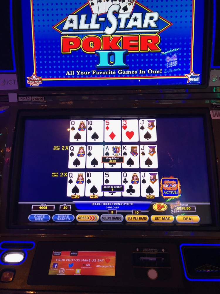 double double bonus ultimate x. She hit a four of a kind with 12 x And less than five minutes after that a royal flush on one of the three lines she was playing.