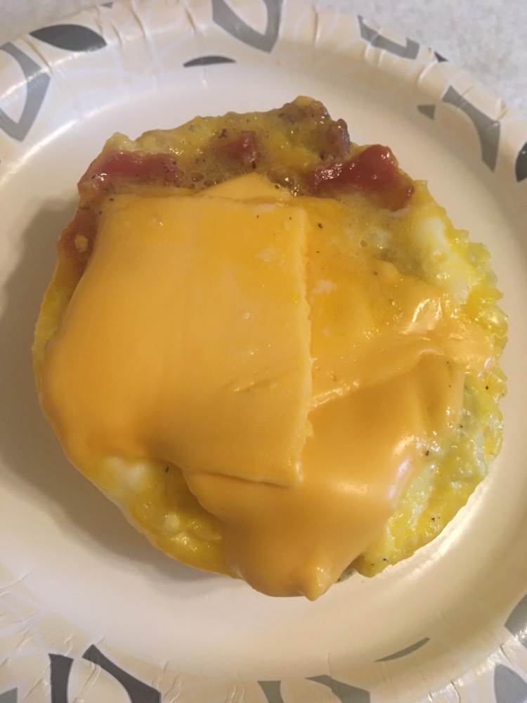 I called this my guy omelette because even a guy can do it. Very simple thick cut applewood bacon, two eggs, one slice of cheese broken up, microwave in a clear Pyrex bowl for 45 seconds. Give it a rest for half a minute and then another 15 to 20 seconds both on high. Yum. The bacon is cooked ahead of time. The Mrs. took care of that. I add the cheese part way through.