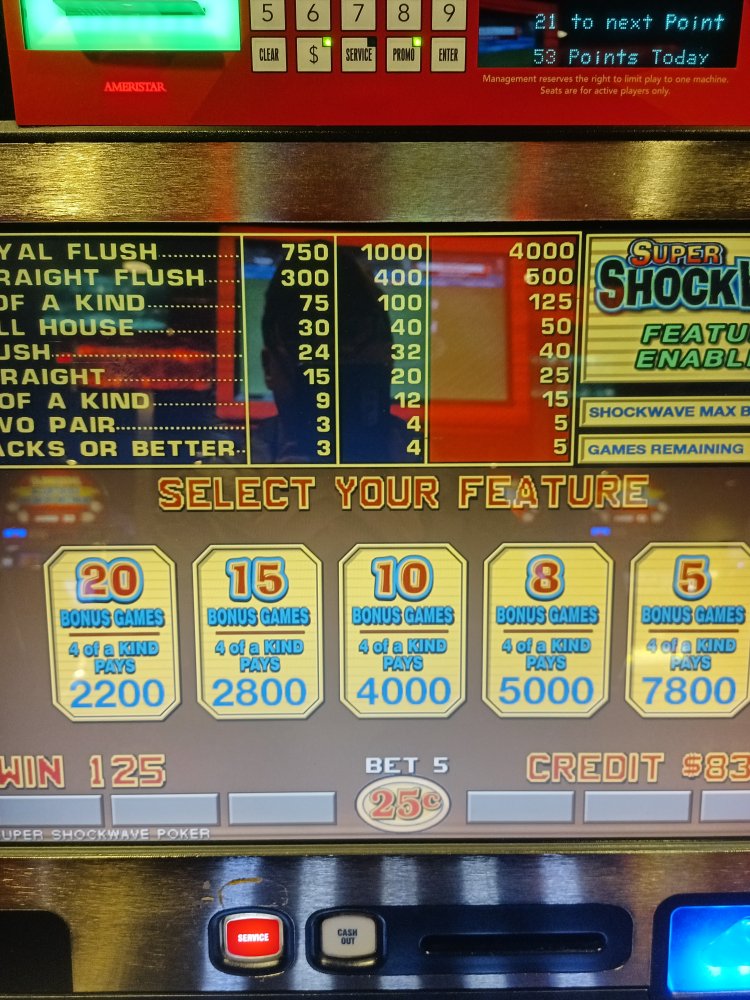 Right after I took the above pic, the screen went black and I didn't even get to play my bonus hands. The tech came over and he couldn't get anything at all to come back - completely bricked. They didnt even know many credits I had on the machine, until I showed them the pic (and had witnesses). I argued that the bonus round was off considerable value to me as a player. So, the floor supervisor gave me a $40 dinner comp and the promise that if they are eventually able to restore the machine they will credit my players acct with what I would have won. As of last week, the machine was still dark. If I had been playing dollars....