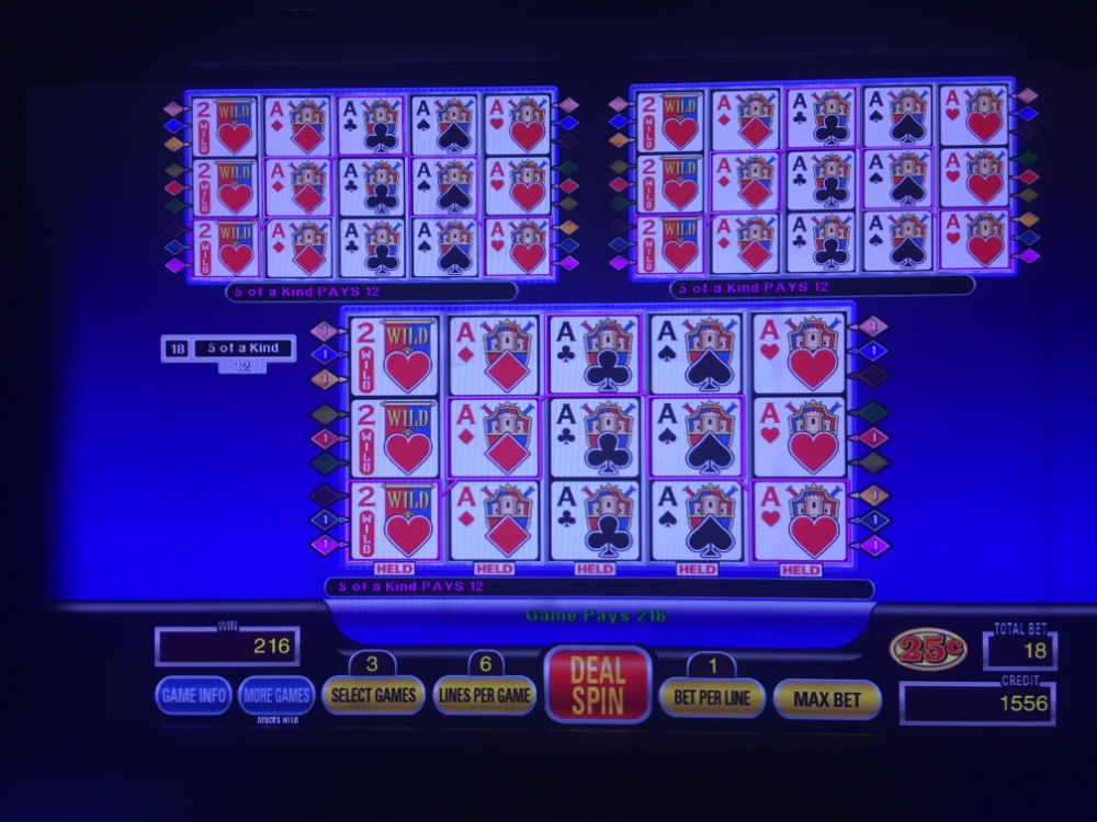 Taking a break and had to check in before it got too late. I had some nice hits over 3 hours of play so far. Anyone who plays DDB is going to go nuts when they see the pic of the dealt Aces with the 2. Ugh!!! These are only 97/98 percent machines, but at least they pay correctly for the Royal for bet 1. Hope I don’t give back the 130 I’m ahead later. Solo tonight. The Mrs has early appointments and a girlfriends luncheon tomorrow.