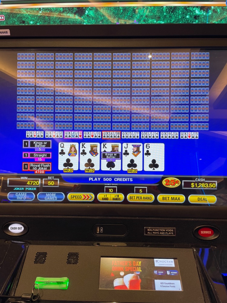 Up to Missouri to visit an elderly family member turning 97. Stayed at Choctaw Durant on Thursday to split the long drive in half. The complex is nice and the new Sky Tower, built since we were last up there pre-Covid, is outstanding and beautiful. Go in early and had tickets to see Top Gun:Maverick early in the evening-super movie. Choctaw has a few quality games NSUD, 9/6 JOB in $1 denomination but they've never had 50-100 play multi-hand machines in our time up there. The new Sky Tower addition now has a huge area of non-smoking (probably around 1,000 machines and one nice bank of VP next to the Poker Room with 3-100 play machines. Rarely get to play Joker but found Kings or better and played through most of my money and then caught this nice Royal.