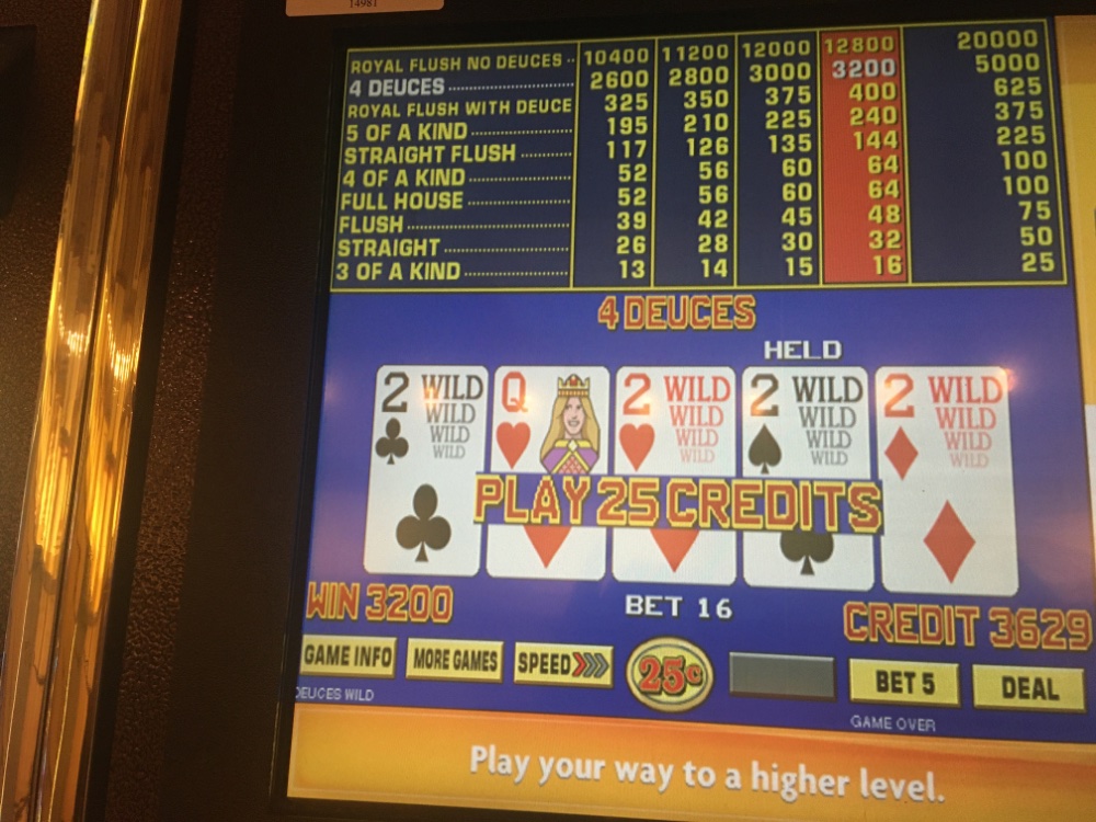 I just have to get over the overly aggressive play. The hand pay actually hit when I was down a bunch still leaving me at -300. At one point after that, I was up 100 due to hitting 3 Wild Royals, but then everything fizzled and I tried to make it up with halves and dollars. I did limit my bet amounts, but playing between 5-10 bucks hand will put you negative fast even in a short cold cycle. Ended up down about 600. The only minor positive is I did make my what they call Personal achievement goal which they just jacked up from 34 to 51 status points. The only way I made it was it was triple points day today. So next time I come I will have $100 free play waiting for me plus whatever amount will be there for that day usually 20 bucks. I am going to cancel my room reservation for tomorrow as punishment both for myself and the casino for jacking up the status point number I need to hit in a gaming day to get 100 in free play. If they see you are hitting your goal 2 or 3 times they hack up the needed goal amount. To me that is flawed thinking because all it does is make me not even try for the goal. In other words my coin in for that trip might be 1/2 what it would be otherwise. We all know more coin in means more profit for the casino. Especially when you need to cycle through 500 bucks just to earn one status point. That translates to 17x 500 extra coin in just to get 100 in free play. 51-34=17. They also jacked up the Mrs points needed for a mere 25 in free play from 15-18. I know how she is when they do that. She will play a short time then go read or watch a movie. I don’t think the casino gets it though. I know this post is kind of wordy. I just want players who may not see through all of the tricks to have some extra information. We both will go on Wednesday if everything at home is OK and take it easy on that trip. Probably nice dinner, maybe catch a game or movie and keep the play to just a few hours.
