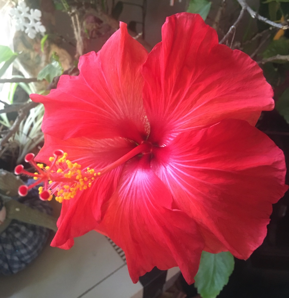 Very unusual. 4 blooms in one day today. Indoors. Getting harder to bring this in for the winter. The plant is over 6 feet tall and in a giant pot! Heeeee
