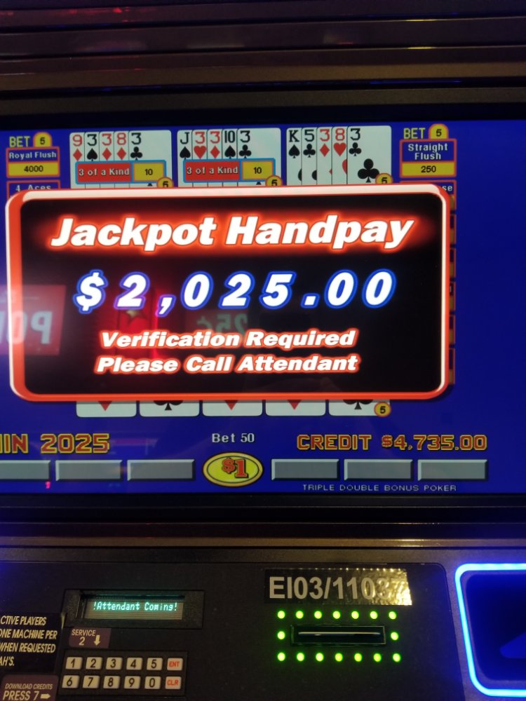 I hit back to back with the slot attendant standing behind me after clearing the machine on the $2,515.00 payoff. I hit aces without a kicker 3 times and several $500.00 straight flushes on ACJP.