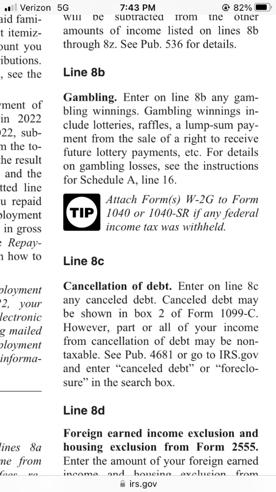 I have attached two pictures. One from the 2022 IRS 1040 Instruction booklet and one from the 2022 1040 return itself. The instructions clearly state to attach the W-2G forms to your return if Federal tax was withheld. However, the 1040 itself just uses the word tax withheld. I’m going with the instructions. Because Ct has a severe and expensive rule on taxing you on Federal AGI instead of your taxable income like the Feds, I need to have State tax withheld to the tune of 7 percent on my W-2Gs. The 1040 form should insert the word Federal, but as you can see they didn’t. This causes even more confusion because to write off gambling losses on your Fed 1040 you need to itemize on your return. Of course State taxes paid would be part of your itemized deductions making one wonder about attaching the W-2Gs to your 1040 return. Makes it easier of course not to attach them if you are one of the few who still do a paper return. I do because I like to read and understand not just hit mindless keys on prompts that can be confusing and full of glitches.