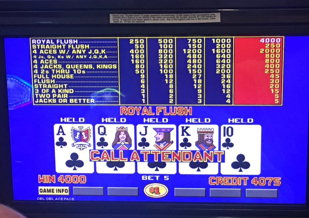 I am officially the Good Luck Charm Chump, Poker Patsy, etc. For the second time in just under three months, the adjacent carousel machine hit a RF. This one was more painful, as I left it after a flush. The guy was about to sit down at an open one. He saw me rising and said, “You’re leaving? I’ll sit there.” I’d taken a loss and went to the quarter progressive. I returned about forty minutes later for his dealt RF. I was so bummed that I kept on losing at mine. I will of course omit the image of the cigar chomping bald man in the interest of privacy and decorum.