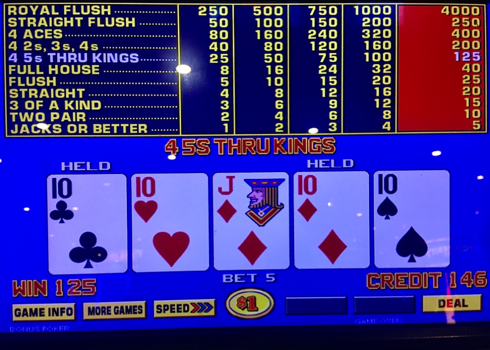 Fine Friday. I won my $25 Caesars table FP on a four point hit. I won $25 on quarter JOB. While I gave both back plus $25, I hit a max dollar quad. A +$15 at Resorts capped the night. Net Day: +$75. 25 TCs.