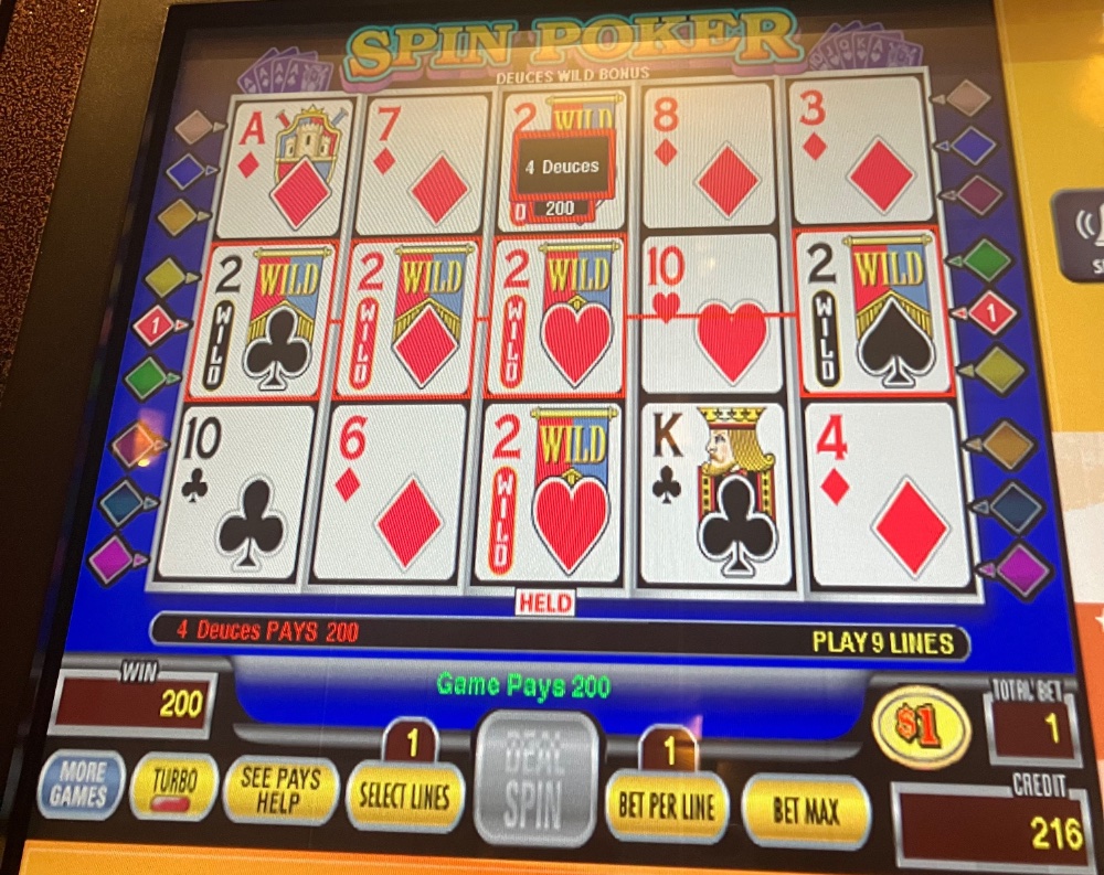 Up, down, and out…..damage control kicked in. I did stumble onto some good news. My formerly favorite pre Covid machine has been re programed to its pre Covid settings, is back to paying the correct amount for the Royal for a single dollar bet with just about a 99 percent pay table for the game I play. It remained mostly unplayed the last 3 years. I hate to use the word morons, but the bean counters had changed it to where a bet of 15 bucks was needed to get paid the correct Royal amount. I had complained both verbally and in writing even advised them to review and see how much money I had left at the casino on this machine before they changed it and maybe take a look at its daily take as well from other patrons both pre and post Covid reopening. Anyway for now, it’s back. For how long, who knows. I had a nice hit on it after 5 minutes catching deuces for 200 bucks, but pushed it and ended up down 400. The bean counters should be happy about that.