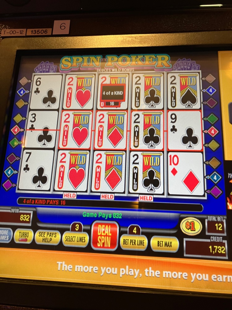 The Bonus Deuces dollar game was 90 percent of play. The Spin Poker on “ my machine “ has 800 for bet 1 or I wouldn’t play it. The nickel and dime Spin Poker is also 800 for bet 1 or I wouldn’t play that. Even though the trip was a success, bets are still too high. The safest way for me to play my machine requires extreme discipline that I am still working on. That would be no Martingale Clone bet increase from bet one until I have lost 80 times my bet level or 80 bucks. Next session I will be moving from waiting for a loss of 10 times my bet to 20. At this point preservation of Capital is the goal. The 2024 goal is to recover if possible the huge losses from 2023. The stock market so far is helping with that, but there’s no guarantee of that going forward and I am at this point very nervous about the market. PS….The reason I chose 80 as the loss number to go up is that is what 5 Aces pays. That appears in my play just about every session even if quad deuces or a Royal doesn’t. There is no system to guarantee a win or the casinos would close. The best I can do is to manage my money without busting and hope for a win.