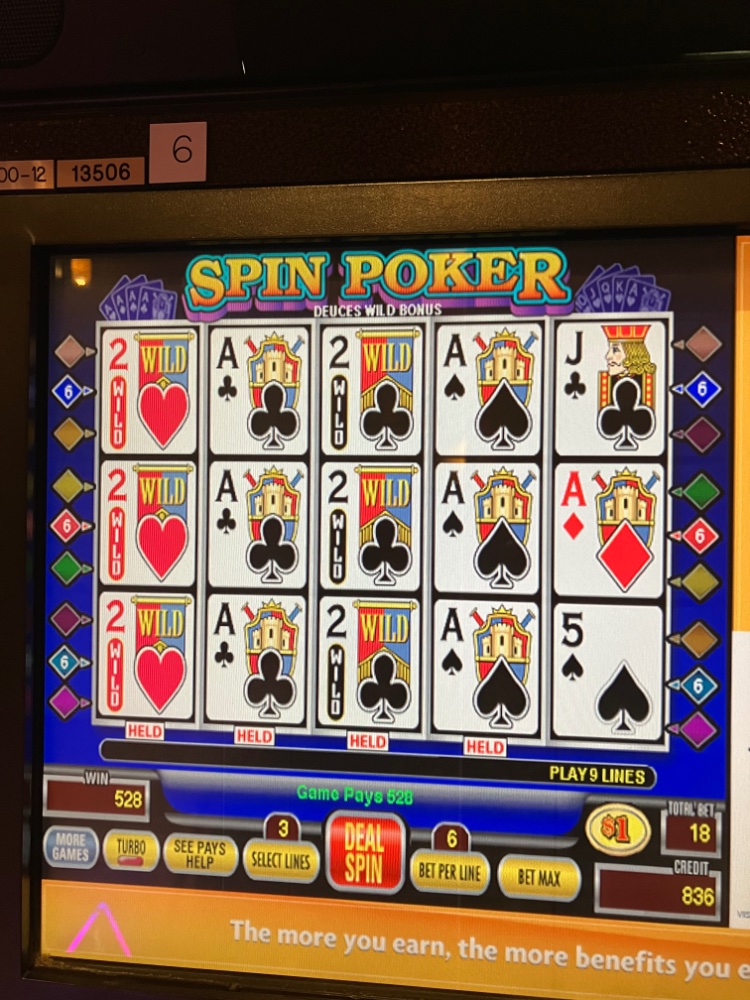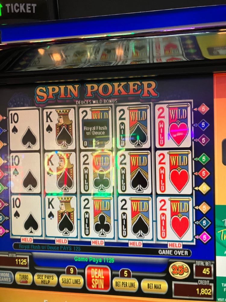 Meant to mention that sometimes you cannot break a dud cycle even in a 6-8 hour session or longer. Today is a prime example. Every machine we played that offered Bonus Deuces Wild Spin Poker was a dud. Funny thing is they were the same machines that were quite giving last evening. We could not buy is Royal of course, quad Deuces, or even 5 Aces. Unless you have a flood of Wild Royals, you need one or more of the 3 best hands to get and stay ahead for the session. So what happened? We gave back a big chunk of last nights winnings. In a combination of desperation and ESP, I played the same game, but on DDS. Had a nice hit with 9 quarters in which you will see pictured. That helped recoup about half of last nights session gains. The person next to me playing eights or better double down stud joker Vp nailed an extremely rare hand. A dealt Royal. He had bet ten and of course doubled after seeing the first 4 cards. He nailed a huge win of 40,000 quarters.