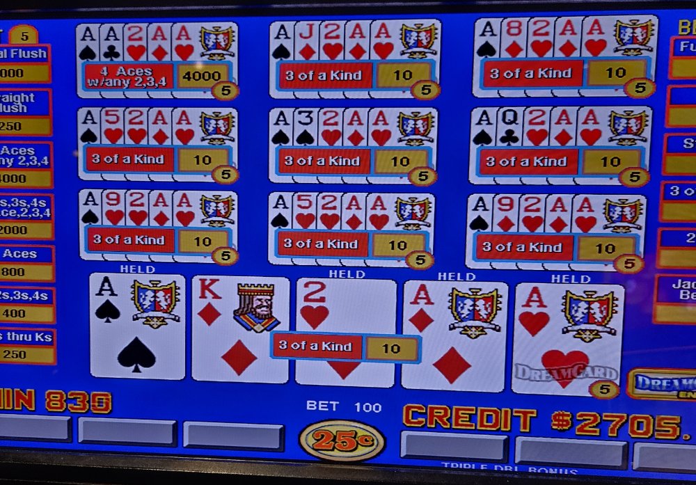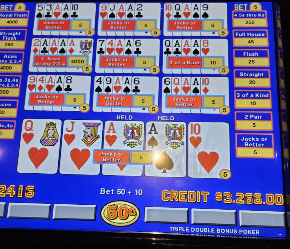 I decided to take some of my Bally's Bounty to Four Winds, New Buffalo last night to tempt fate. I came out on top this time. Besides hitting these, I was also dealt quad 6's and quad Q's for $625.00 each. At the end of the night I decided to try Super Draw 6 Poker and dumped a couple hundred without hitting anything. I was down about 1k before the first AWAK hit and wasn't down the rest of the night. Dream Card started to not be so dreamy, so I jumped machines to an All Star II 10 play TDB. Pics are in order that I hit them.