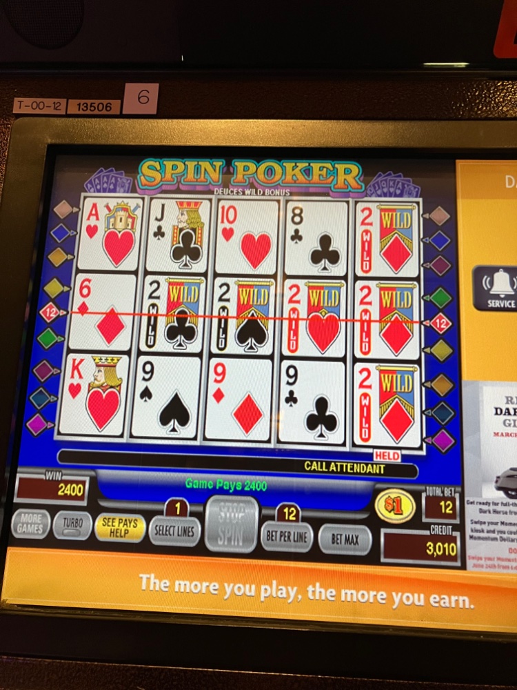 Thanks again. Yes back into the black for the year. The funny thing is FAA, one would think the 40 times your bet is a big loss, but on the game I play, it can hit that in as little as 15 minutes. However, in attempt at not busting, let’s say I lost to keep it simple 40 bucks at a dollar a bet. I go to a 2 buck bet and hit immediately a wild Royal at 25 for one. In ball park numbers my next bet would be a buck at position 15 meaning when it gets to position 40 it’s time to to bet 2 again. Easy to do in your head once you get used to it. The biggest downside is the hours required to eke out a nice gain 8-12 hours of play Just as a side note. All of those hits were on the same machine. There were terrible dud streaks, but my rule of 40 kept me from coming even close to busting. Will it work long term?? I have no idea. After lunch, I played it again for another 2 hours. No hand pays, but I had both a dealt straight flush and 5 Aces that took me from -250 on the post lunch session to + 400 for that same 2 hour session.