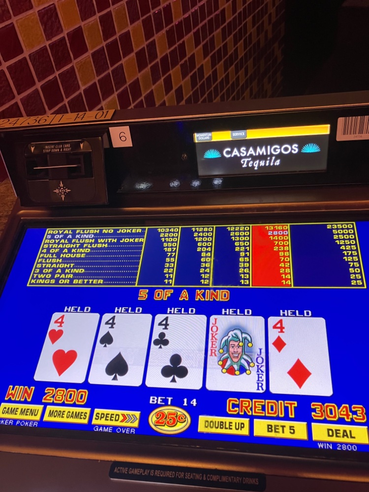 Unfortunately, yes. It’s the only 98.8 Dollar Machine that Has bonus Deuces Wild with a 800 for bet one on the Royal. I haven’t had much luck on any of the other machines at Bizarro. At least not consistent luck. It’s also been hitting 4 Deuces with the Ace and 5 Aces too more than average over the years. I don’t think I have ever been ahead at one point in a session over 5 grand without hitting a Royal on the same machine. This one did it twice already this year. The only exception to that is 3 or 4 hits lifetime on a DDS machine which pays huge for a Dealt Royal. They are only about 97.5 return, so I don’t play them much anymore.