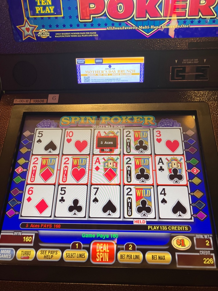 The maximum I could win per hand at the bet 3 level is 2,400 for a Royal, 1200 for. 4 Deuces with an Ace, 600 for 4 deuces, 240 for 5 Aces. Of course if I have to go to bet 3, I will hope for the the Royal or 4 Deuces with the Ace. At that point, I think I should quit while ahead.