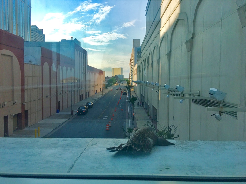 This seagull flew into one of the many windows above, meeting its demise. It fell virtually beside my feet, separated by glass, in the convenient passageway between Resorts and Hard Rock. Omen for my trip bankroll. Borgata is in the background. I’ll avoid play in all. Casino Bermuda Triangle.