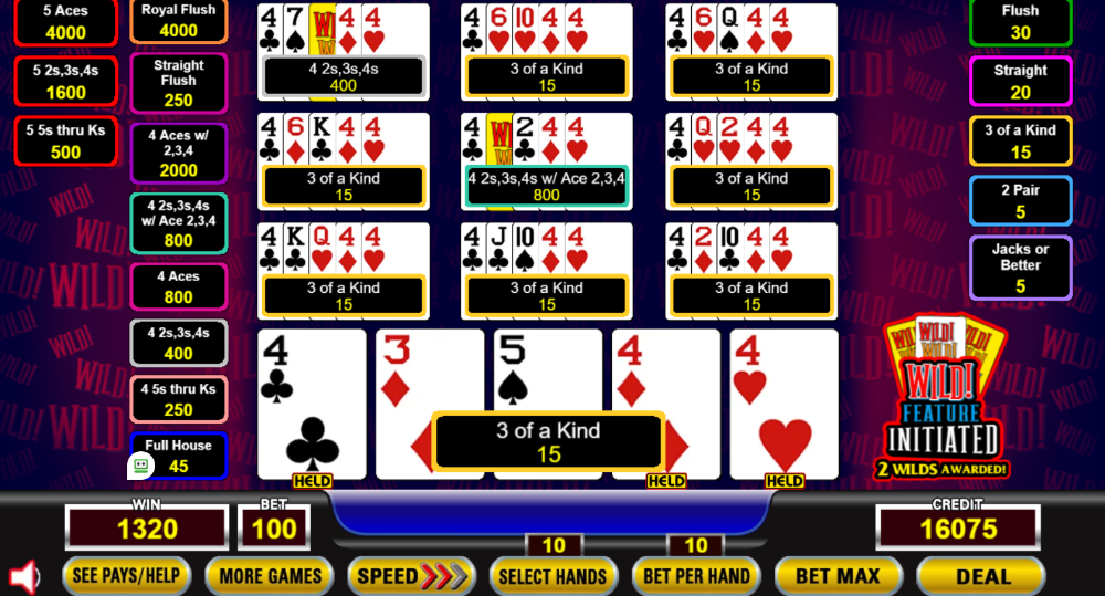 You of course won't see the Wild cards every time since they are just 1,2, or 3 additional cards in the deck. But the end result is many more royals and quads in this game (with natural payouts, not reduced wild payouts), so I think a lot of players will enjoy it.