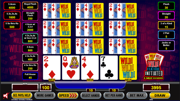 • A Joker Poker game with 2 Jokers available called “Double Joker Poker” which is very rare to find in casinos in the U.S. In Wild! Wild! Wild! Poker, a scenario where 3 Wild Cards is introduced to quite possibly for the first time in which players will need time to get used to
