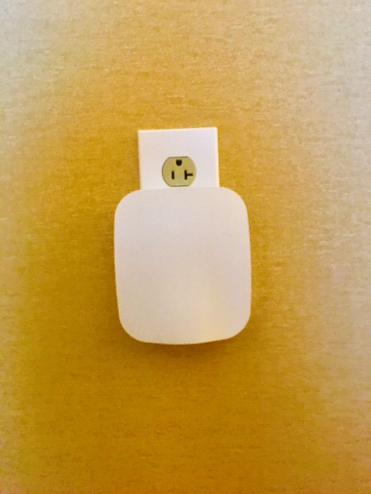 The room had a creepy white box gadget plugged and locked into the wall. I just learned that it is a smoke detector. A blue sign on my desk warned that if smoke is detected, patrons are fined $500. I’m taking smoking rooms from now on. Higher floors and no ominous Big Brother Orwellian fixture. It just gives me a bad vibe. AC is allegedly all about good vibes only.