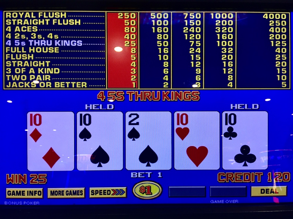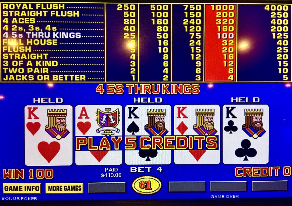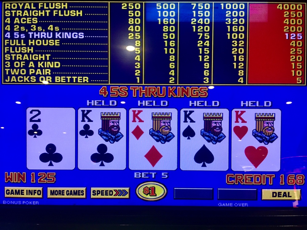 Sweet Saturday. I lost my $25 Caesars table FP on a self rolled six to out. I won $10 on my $25 machine dollar BP FP. My favorite machine wasn’t taken by the usual human roadblock regular. I settled in and couldn’t lose in overly cautious play. Within a brisk forty minutes I was mercifully dealt a max quad Kings. I was so startled that I quit; not hard wired to stay just yet. White House Hard Rock lunch. I won $25 at Resorts. On one cardless machine, I looked down to fortuitously find ten dollars credit on TDB. Figured that’s two free spins, Jim. No luck, Chuck. But I won on BP shortly thereafter. Net Day: +$152. 18 TCs.
