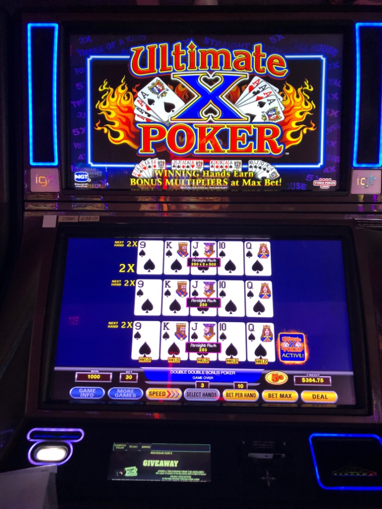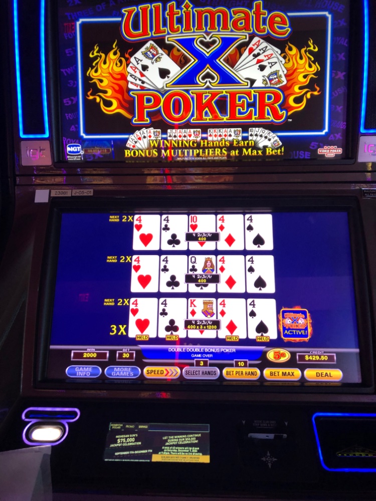 I went back up Thursday evening and played dollar DDB which I never do. I guess it was the Mrs track record compared to mine that convinced me to give it a try. On my 800 for one machine, I could only get 9/5 not 9/6. I came very close to getting a dealt Royal ( pic ) Hit 4 Aces once, but overall was on the ropes and near the end of my rope as well when the hand pay came in. ( bet was way too high ) but that’s where the Clone took me. I ended up even after 7 percent for the stupid State withholding. ( my choice ) to avoid a big estimated tax penalty. I didn’t play Ultimate X which the Mrs prefers. I don’t think my bankroll would have held up unless I had other high multiplier hits along the way. On the way home, today I just missed hitting a coyote wolf hybrid on 95 in Old Saybrook. Literally by an inch or two. Ran right across the front of my car from the woods. Something told me to slow down from 70 to 55 and I did. Seconds later…..there he was. Big too!!