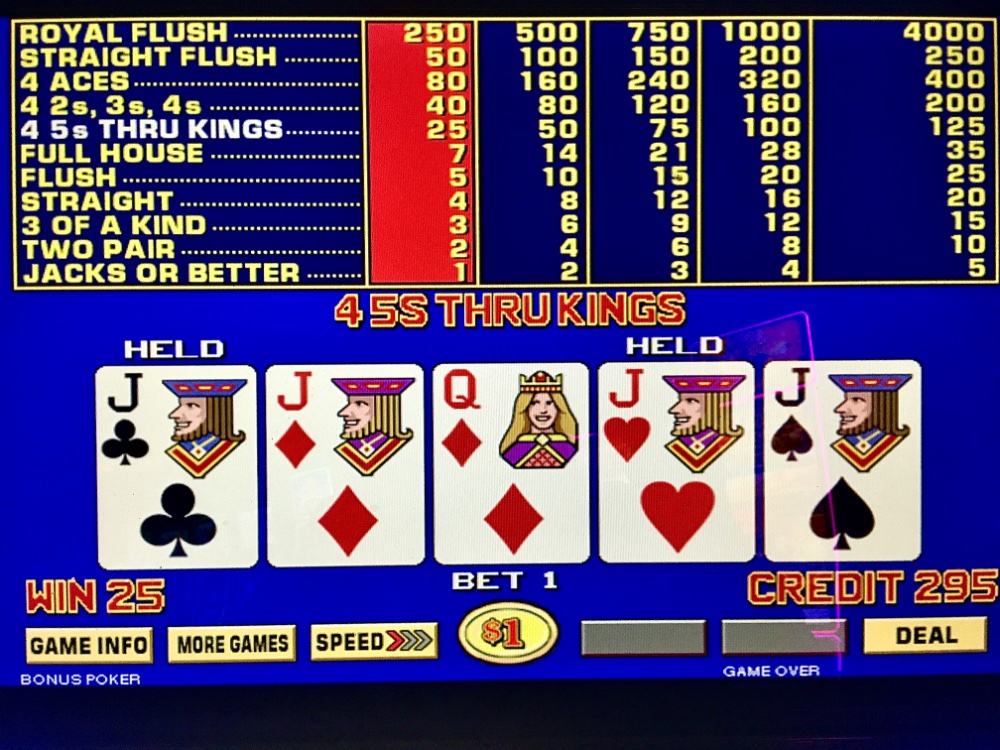 Sorry Sunday. I won $34 on my $30 Resorts BP FP. Jitney to Harrah’s. I saw a $2,400 quad DDB, a hopeful sign. But I was dealt quad Kings ninety minutes later. Adjacent machine hit for $1,500, so I stayed. I did get another quad and quad fours in the next fifty five minutes. But they were small; a -$42 decision. I earned a Prosecco gift. Worst decision: returning to Resorts’ ice cold machines. Net Day: -$515. 313 TCs.