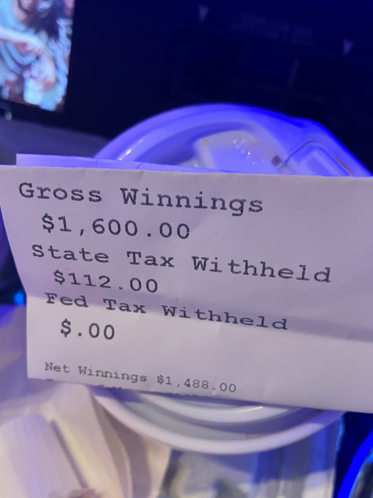 Now this is just unbeliveable. Right after breakfast on JOB quarters. Another Royal with 8 quarters in. Held 4 in diamonds. I messed up the pic. Here’s the ticket pic. Not as colorful….. oh well. Lamont back on stage for an Encore!!!