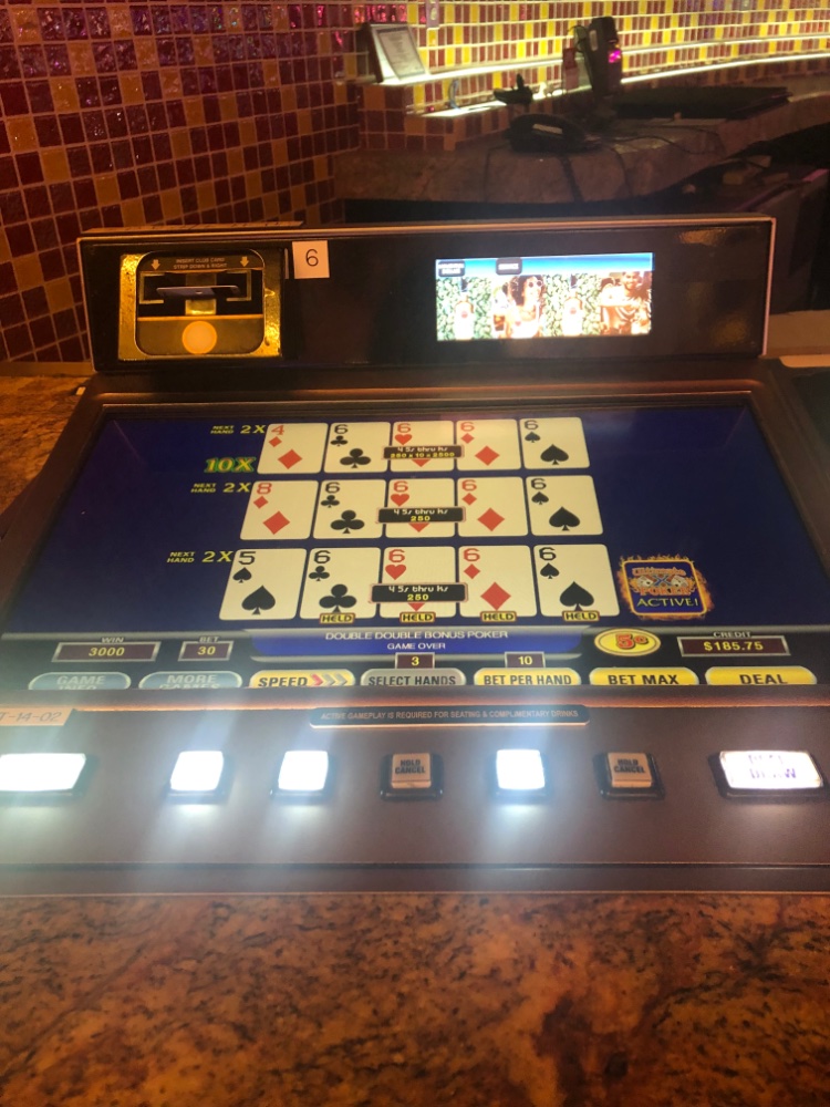 She has as much as 400 because you are betting 10, but only getting paid for betting five unless you have a multiplier. Once in a while, all of the quads and full houses that she gets are without multipliers that’s when she could lose four or $500. It doesn’t happen often but it does happen.