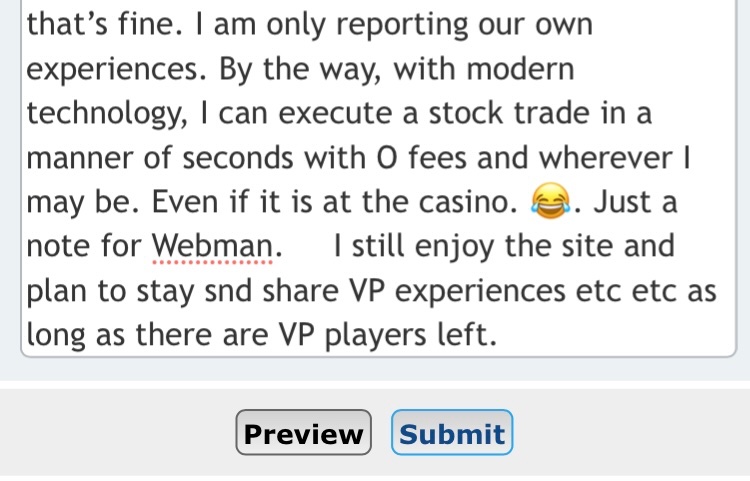 Ditto. I don’t see that changing either. Just my opinion, but there is something different with the machines now. No recent winning sessions. I used to spend 150 days and nights at the casino. The automatic reporting of trades by brokers such as Fidelity, has made day or short term trading much less burdensome tax wise. Not only that, I get paid substantial dividends while waiting for a stock or fund to go up. I have never had a positive year in over 35 years of playing VP. With the continued degrading of pay tables by the casino, there is no way that will change. Mrs and I still enjoy going to our smoke free casino, but at this point, it is mainly to take advantage of the free stuff while it remains, or just to go for a good meal on the house sometimes. Unfortunately, the casinos being greedy, did this to themselves. Others may fare better than us and I wish them luck, but I think overall winners will be few and very far between. One would think that always double digit annual windfalls and sometimes close to triple digit would be plenty for our casino, but such is not the case. Others may disagree and that’s fine. I am only reporting our own experiences.