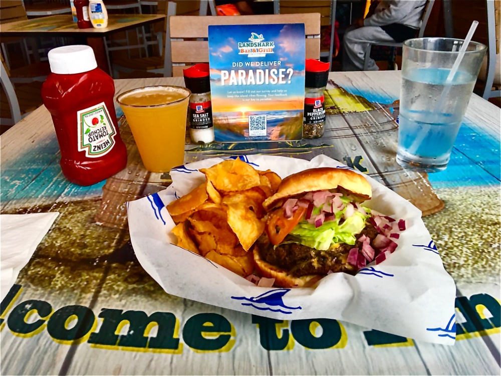 FAA loves a meal deal. I returned to Resorts famished and ready to return to the old standby, Doughtery’s happy hour. But a sign at the 5 O’Clock Somewhere bar beckoned me just across the Boardwalk to Landshark Bar and Grill, where I happily indulged. Among the beers on tap is Voodoo Ranger, as I came to discover a 9.1% IPA. Dare I say, it was a hit. I loved the potato chips. There was still skin on one. A pickle spear, lacking snap, is obscured. The burger, a tasty double smash, quelled my hunger. I asked for onions after I overheard another more detail oriented waitress mentioning it to her table. Mine was the nose ring space cadet type. She brought back a ramekin of chopped onions. Well, don’t cry over chopped onions. I waddled off quite content after the day’s winnings.
