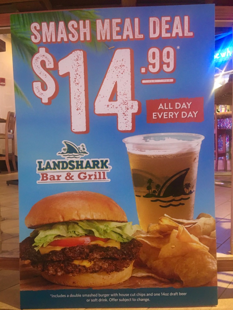 Update: Landshark combo is indeed still $14.99. Their poster is still affixed at the 5OS bar. Margaritaville patrons are advised to walk another 30 yards, get much better views and save two bucks in the bargain. FAA, VP News.