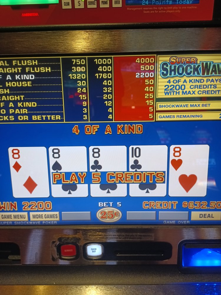 I believe this "Super" game has been out about a dozen years. The Shockwave game feature, prior to Super Shockwave, was that any quad hit during "regular mode" wins a normal amount based on the regular mode pay schedule and also triggers the machine to go into "shockwave mode." Shockwave mode would last for a maximum of 10 hands where a 2nd quad would be worth 4000 coins. The 2nd quad would push the game back into regular mode if the quad was hit in hands 1 thru 9 after the first quad.