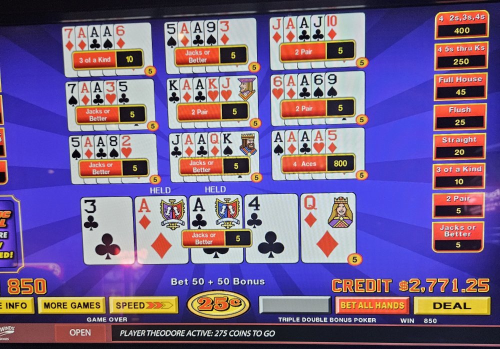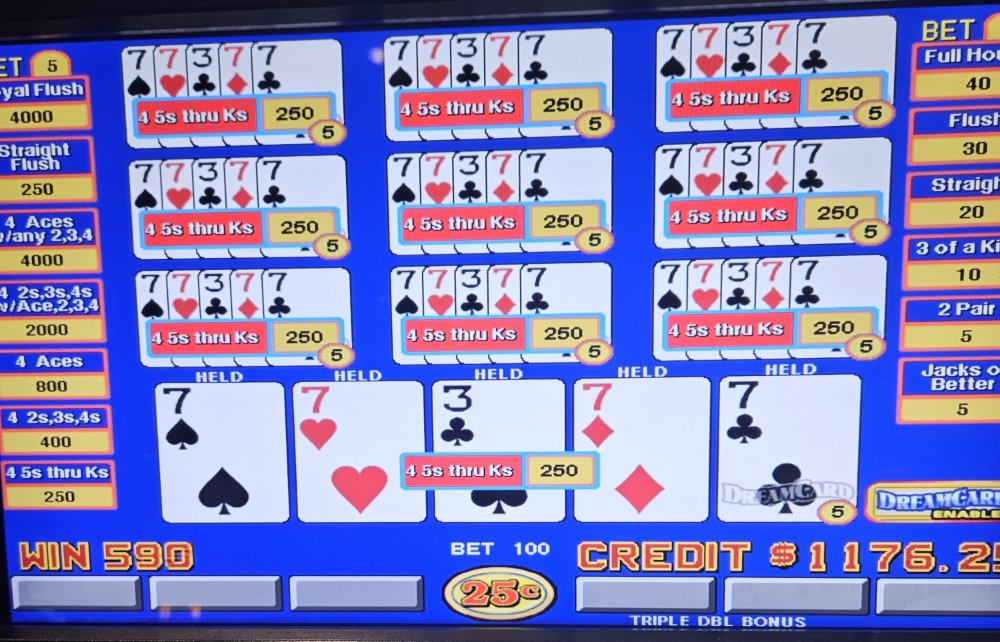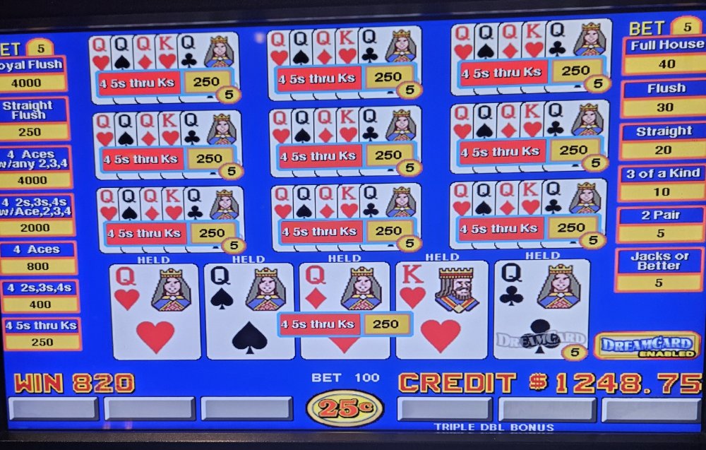 I got there and settled in front of my favorite Dream Card machine. Loaded it with 1k along with $175.00 free play and set out. Within a few minutes I was dealt quad queens for a nice $625.00. A few minutes later, still playing Dream card, I was dealt quad 7's for another $625.00. A little bit later, I was dealt quad queens again. I was beginning to think that this was going to be a good session. I pressed draw, thinking I was going to see 10 hands of 250 credits each, nope. I was staring at 130 credits won. I looked and I realized that I FAILED to hold 1 of the queens. I was so mad at myself.