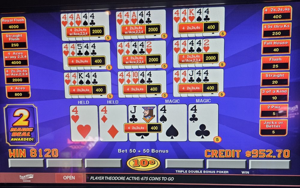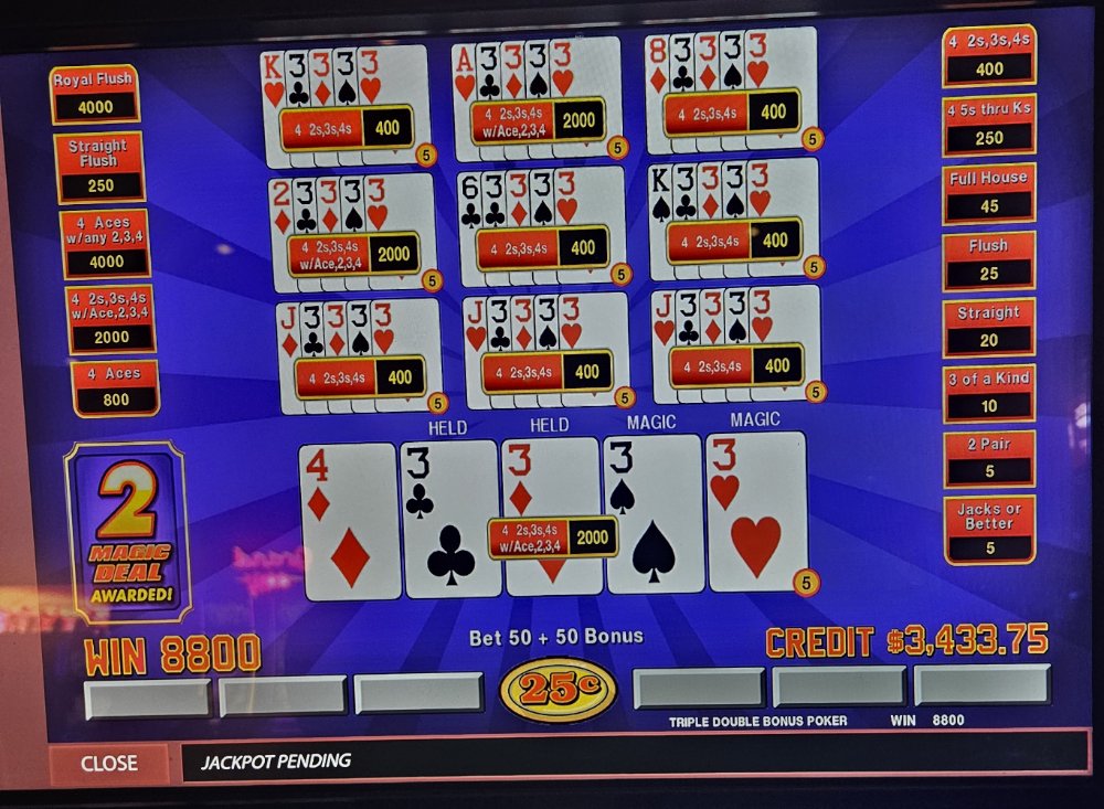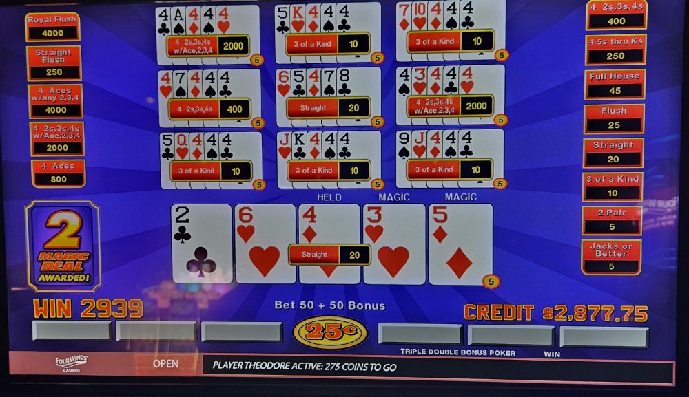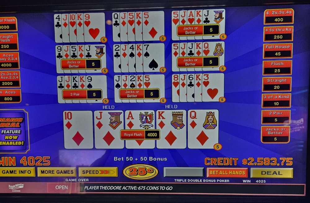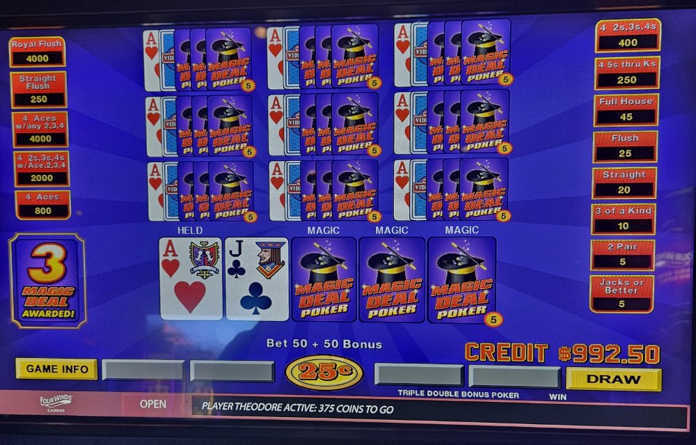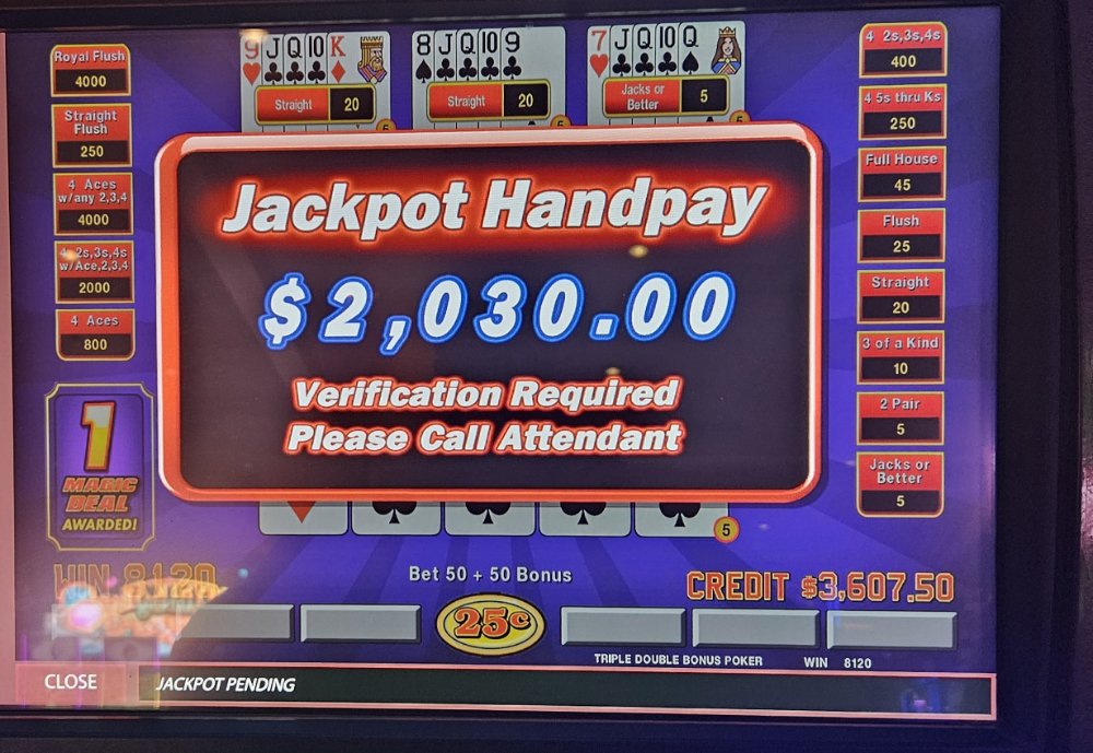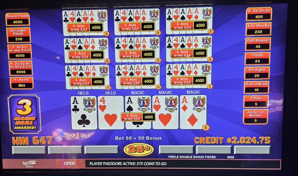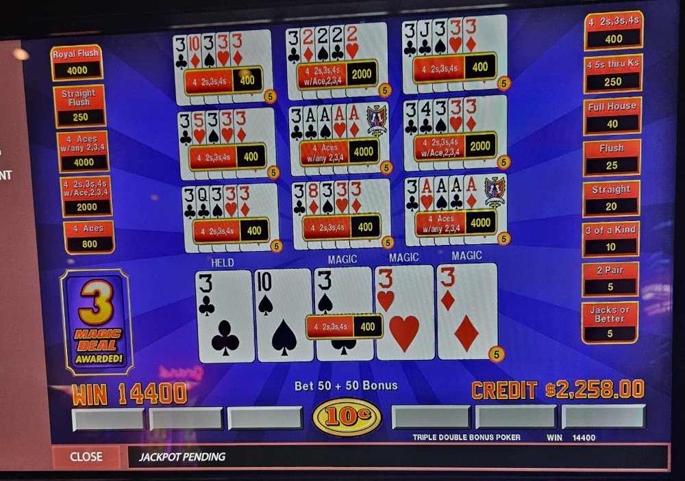 I was dealt trip aces 3 times in a row on the Dream Card machine and didn't catch the 4th ace any of those times. The machine started eating my credits so I bailed and went to a Double Super Times Pay machine. Seeded it with 1k and nothing. N-O-T-H-I-N-G! Not a single 4ofak at all! That 1k vaporized. I couldn't go out this way, went to an ATM and got another 1k and went to a different Double Super Times Pay machine. That 1k went down to $300.00 in about 45 minutes. Feeling like a turd, I took my remaining $300.00 and went to a Magic Deal machine and began playing .10 denomination. A few minutes in, I hit That $1,040.00.00 gave me some more green to play with. After a little while, still at .10 denomination, I hit Feeling reinvigorated, I then decided to up my denomination to .25. A good decision, as