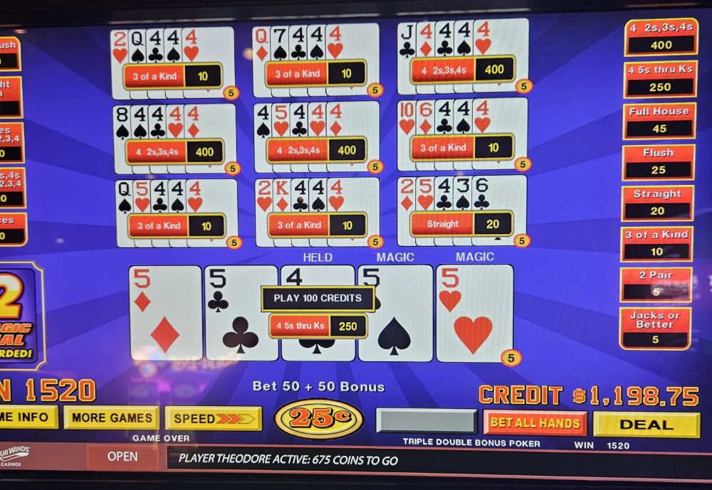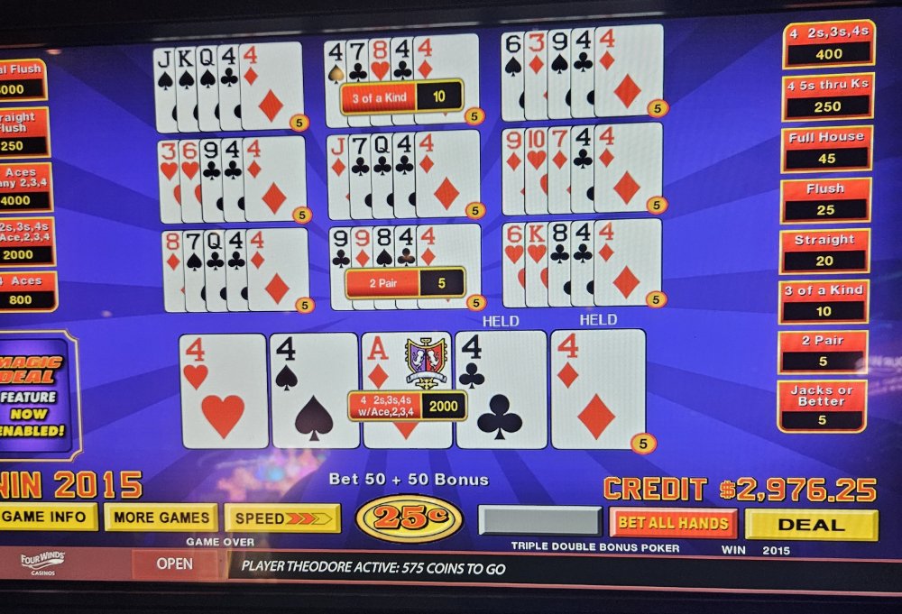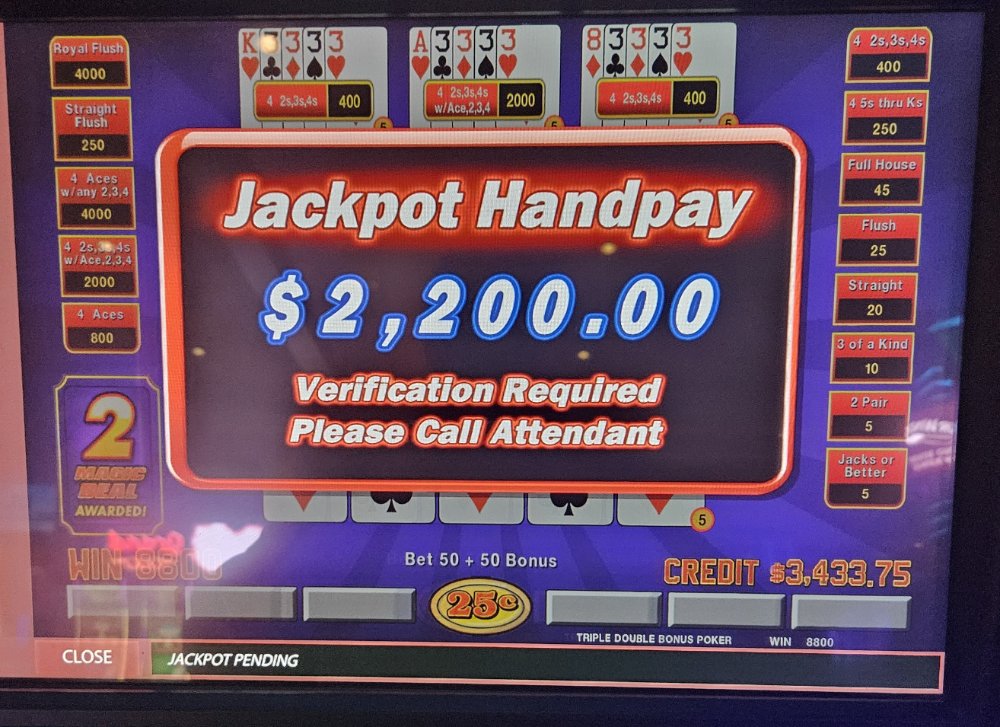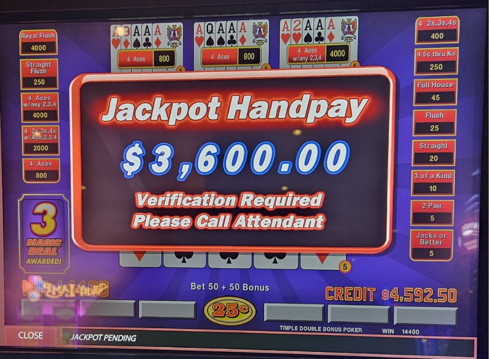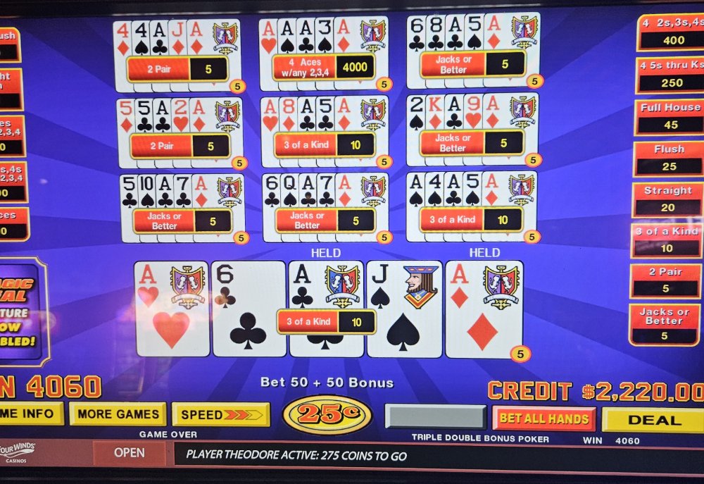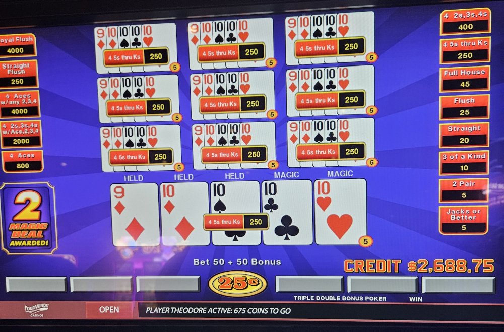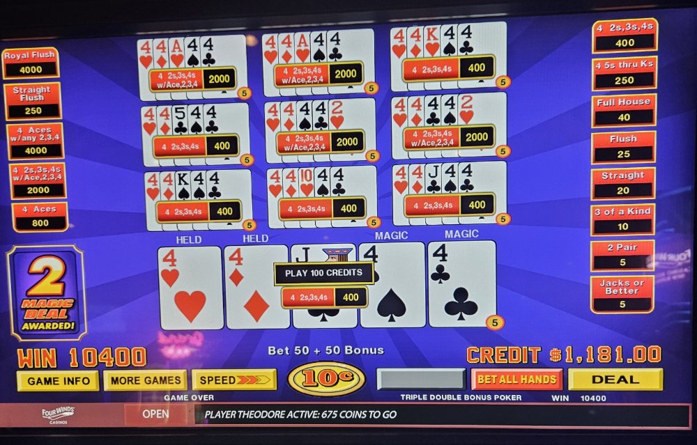 I was dealt trip aces 3 times in a row on the Dream Card machine and didn't catch the 4th ace any of those times. The machine started eating my credits so I bailed and went to a Double Super Times Pay machine. Seeded it with 1k and nothing. N-O-T-H-I-N-G! Not a single 4ofak at all! That 1k vaporized. I couldn't go out this way, went to an ATM and got another 1k and went to a different Double Super Times Pay machine. That 1k went down to $300.00 in about 45 minutes. Feeling like a turd, I took my remaining $300.00 and went to a Magic Deal machine and began playing .10 denomination. A few minutes in, I hit That $1,040.00.00 gave me some more green to play with. After a little while, still at .10 denomination, I hit Feeling reinvigorated, I then decided to up my denomination to .25. A good decision, as