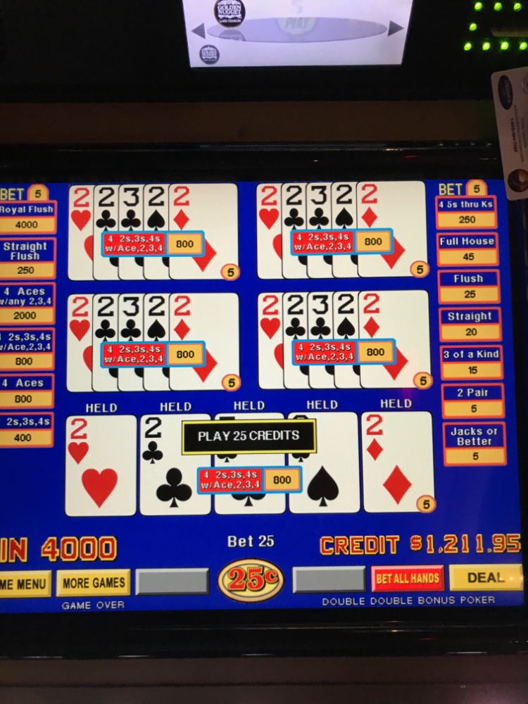 L Coushatta 1,000.00 25¢ Spin DWB Caught 4 deuces (1wAce and 2x4deuces) $1000