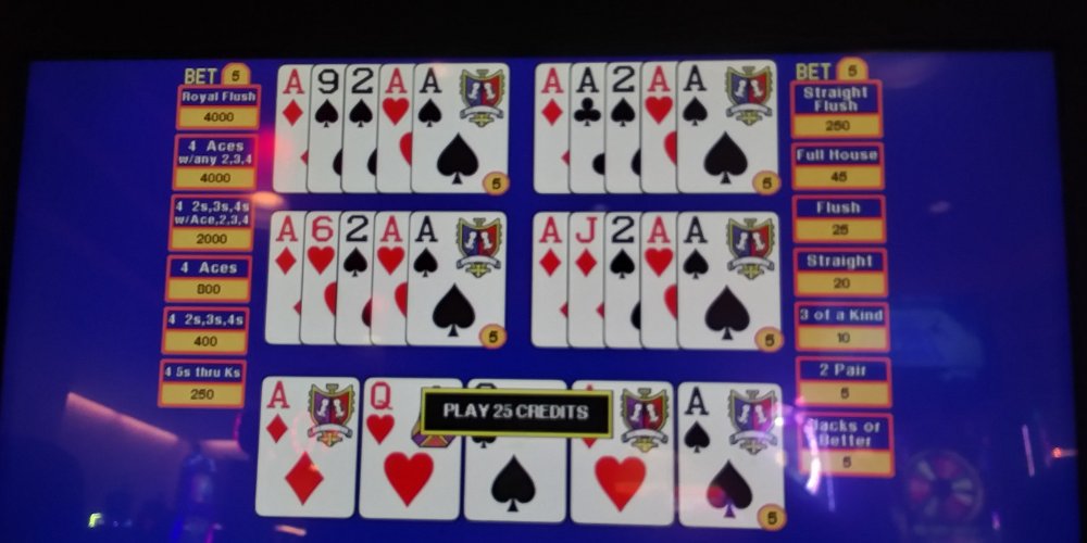I went to the casino today to pick up a small gift on my way to visit a friend (Casino is about 15 miles from my house). Had a few minutes to burn so I played a twenty plus $10 free play. Wanted to see if the VP gods would smile on we. Ok, a miniscule sample, not my normal session, but the results were the same. As you know, the first hand could be a dealt quad. Has happened to me in the past.
