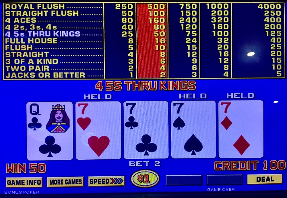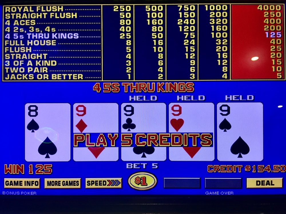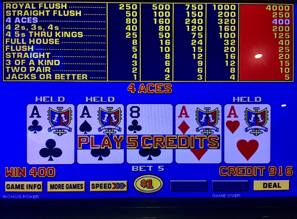 Forlorn Friday. I lost my $25 Caesars table FP on a ten to out. I won $10 on my $25 dollar BP FP. The JOB progressive carousel was down upon arrival. It came back soon, downgraded to 6/5. I lost $220 in two BP hours. Resorts drained $300 in 2.5 hours. I hit an AC ATM; returned to Caesars. Quad three was a blown min bet. But undaunted, I circled back to this machine within five minutes. Fifteen smooth minutes later, max quad Aces. Net Day: -$136. 147 TCs.