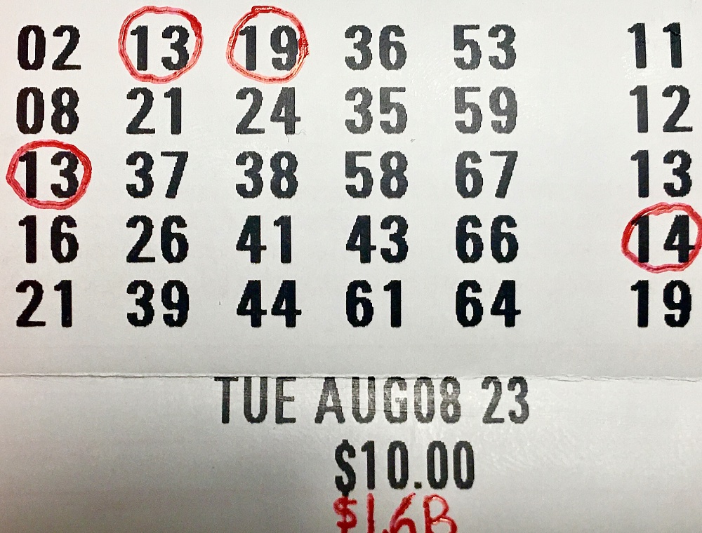 $1.58B Mega Millions. I did hit all five numbers, across ten games. Net Day: -$18.