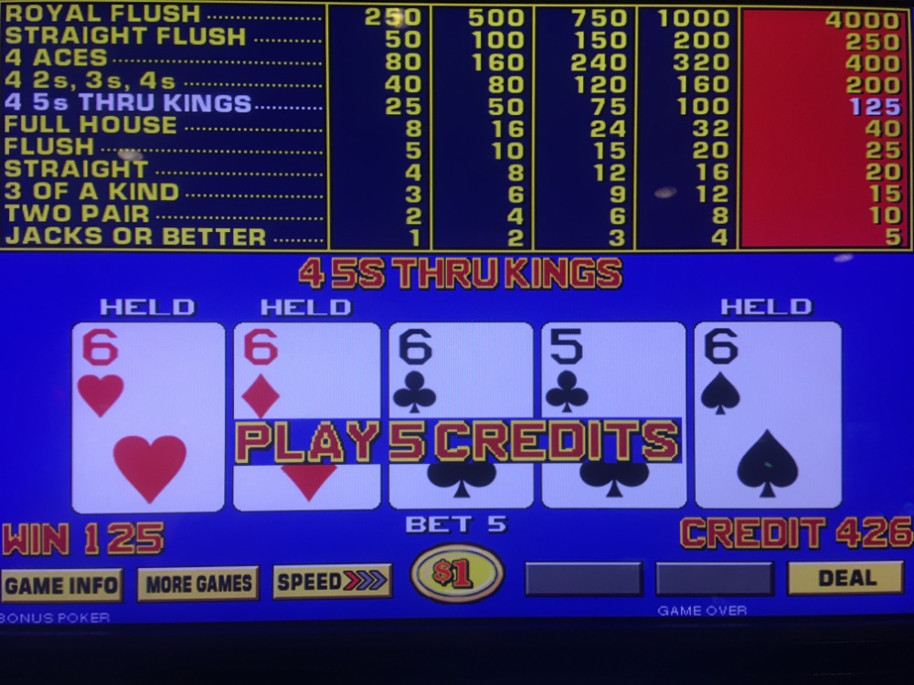 Was just ball parking your playing time at about 3 hours. In that time hitting 7 quads and a straight flush one of which was the better paying low number on BP. Just reinforces to me how important Royals are in those games. Unless one hits and runs early on, the end result after hours of play is almost always negative without a Royal. On quadless days, I have given up as much as 25 percent of coin in on JOB. If I remember, and it has been a while, Bob Dancer has too.