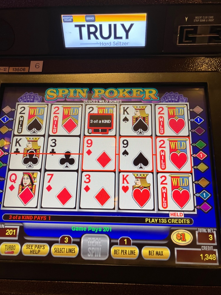 The nickels were just as bad percentage wise as the quarters and dollars, so there goes that theory. Down 200 and tail between my kegs, I get a call from the Mrs that in another part of the casino that she just hit 4800 nickels. I headed over that way, wearing a blindfold and hitting the ATM, I threw caution to the wind. Pics are the result and a few more good ones I forgot to take. Up 1,300 in the Mrs section of the casino. Still down 300 from the last 2 trips, but I’ll take It. As usual the Mrs continues to pummel me on overall results with inferior pay tables. Her pics later or tomorrow.