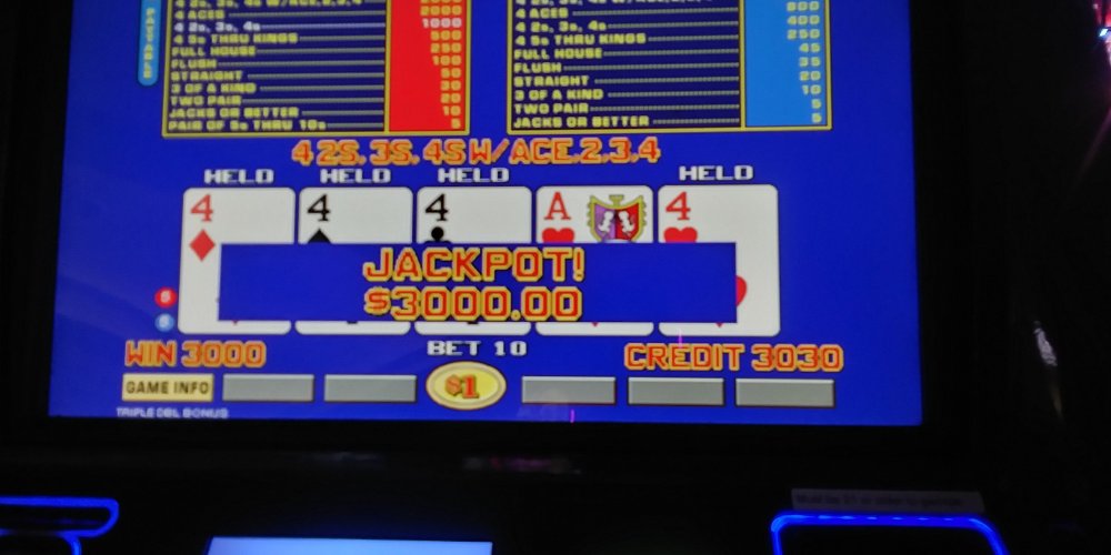 Snagged an open 5 Star machine and quickly lost $500. Less than 10 minutes. Deposited another $200 and played on that for over an hour and a half accumulating 1600 TC. $155 free play, earning an additional $100 then squandered it in short order. Lost another $900 in the next couple hours. Quads for 6 hours work: 10s, 8s, Qs, As, 8s, 8s, 4s(dealt)/A. 19,000 RC ($190), 3762 TC. After taxes +$500.