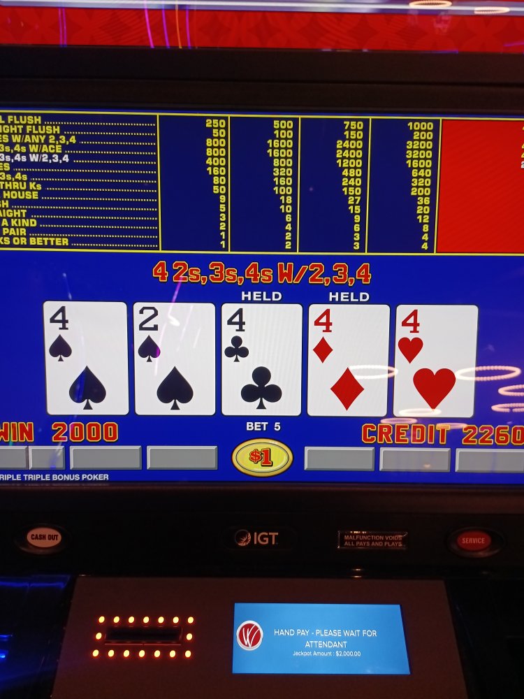 I started with quarter TTB and quickly lost about $600 on single line and triple play. Quadless. I then switched to dollars and continued to get wrecked and was $3000 in the hole, still quadless. Mercifully, I hit a smalls with kicker for $2000 and recouped a good part of my money.