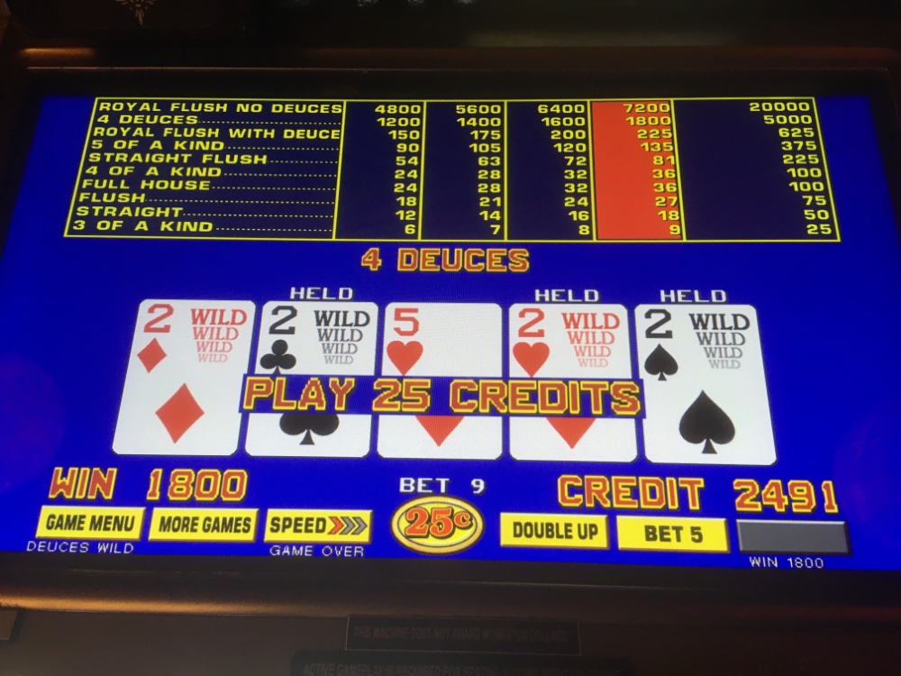 After being so short on quad deuces on the last session, I decided last minute to play quarter airport deuces single line hoping the quad deuces would play catch-up. I would save the triple spin poker for next time. Make a long story short I nailed the quad deuces twice using a fairly aggressive form of the martingale clone.The highest bet I had to play was 18 quarters which is plenty steep. I didn’t have to switch to halves or dollars luckily, and caught the quad deuces twice and to top it off, I only held one deuce both times.