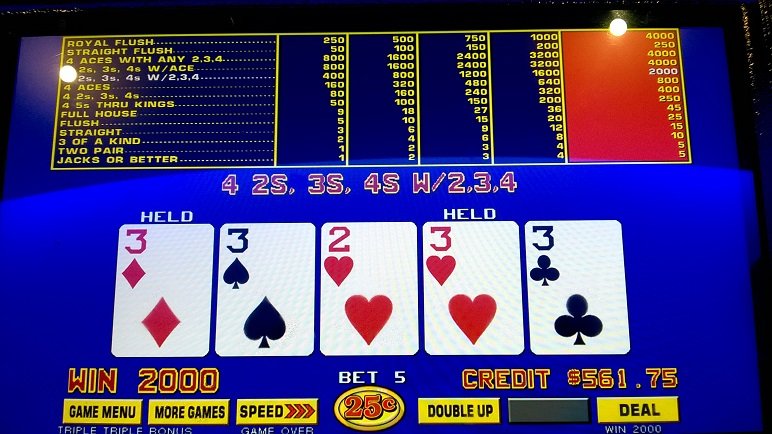 I put $200 away so to get out of dodge a winner, I play on $100 hit the new bar for some TTD. The place is a ghost town. I start at one end playing quarters, about the 6th or so machine I hit, hold two 3's and in come two 3's with a kicker, 2000 quarters!