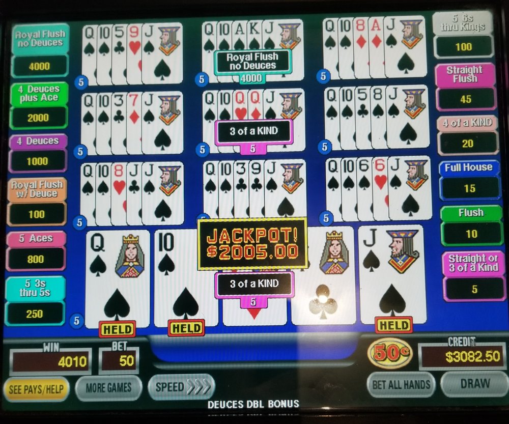 In 2012, me and a friend were playing $5 40/10/6 DDB next to each other. I don't remember how long we were on them, but at one point he hit four aces for $4000. As he was waiting to be paid by check , I hit AWAK for $10,000. I believe he still may have the picture, and if so, I'll see if I can get it.Tedlark wrote: ↑Mon May 13, 2019 6:52 amVman, I should have taken a pic of the Hot Roll royal but I didn't think to do so. That way I could have silenced any naysayers, not that I think you are one of them.