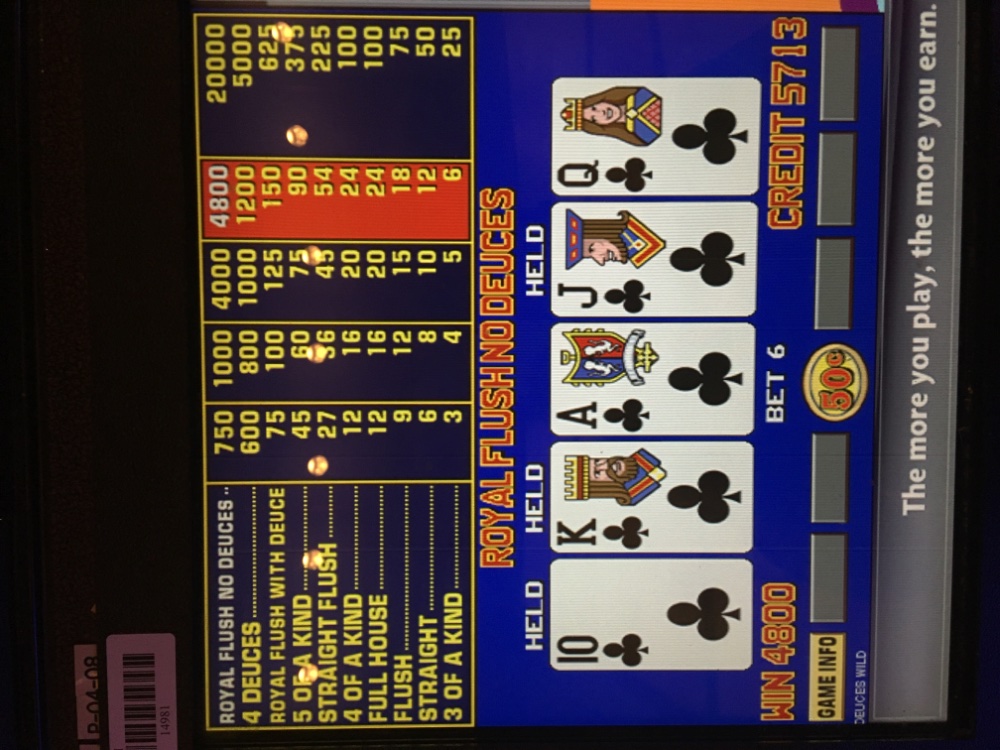 The pics are from last night at Mohegan Sun. My out of pocket coin in was only 200 bucks before the first hit. It was quad deuces on a dollar machine. 98.91 Airport Deuces. 1,000 bucks. Forgot the pic on that one, but it served as ammo for all of last night and this morning. Net result is up 2,000 for the session. That only happens a couple of times a year.. I wasn’t able to pull the ace on the dealt quad deuces