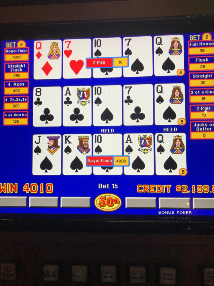 Case, my life has been incredibly blessed and it often carries over to VP. But, I don't show pictures of the losses They occur too. I could never make a living playing the negative VP we play. Keep in mind Sweet C is retired and I'm retired but work part-time for the university now so we can frequently go to the casino. We practice almost every night at home. Second, we usually play multi-hand and may play 5-6-7 hours per day multiple days a month since we drive 2 hours to the nearest casino. We also usually only play low volatility games like Bonus, DW, DWB or Jacks. We also never play the "extra coin games" like Super Times or Ultimate X since they only add a small extra 1/4% or so increase in pay return but dramatically increase the need for a bigger bank roll. Our goal is to stay in the game until the hits occur. Best luck to you and may the VP gods smile on you.
